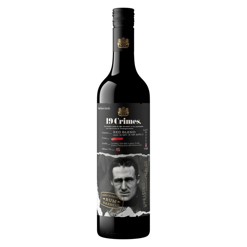 19 Crimes turned criminals into colonists. Upon conviction, British rogues, guilty of at least one of the 19 Crimes, were sentenced to live in Australia, rather than death. 19 Crimes The Uprising Rum Aged Red Aged spends 30 days in rum barrels. Intensely rich with a jammy finish. Notes of sweet mocha, caramel and spice.