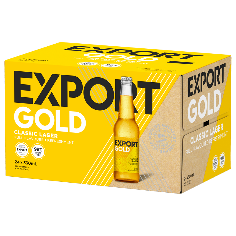 A golden lager characterised by a pleasant, slightly fruity flavour with a clean, crisp finish. Made using only the finest New Zealand hops, barley and pure spring water, it is perhaps New Zealand's freshest and most refreshing beer. Export gold is best served ice cold to enhance its drinkability and refreshing flavours.