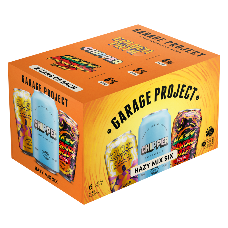 Bring a bit of variety to the BBQ this summer with your new go-to hazy share pack. Each 3x2 box comes pre-packaged with 2 of the following beers; Chipper Hazy Pale Ale - A cheerful, upbeat little hazy. Brewed with plump, juicy NZ grown barley and oats and a choice selection of Garage Project's favourite hops to produce a smooth, easy drinking beer, loaded with lush tropical fruit juice flavour and aroma. Delicious, pure and simple; Golden Path Hazy IPA - A generous addition of Golden Naked Oats and Mosaic, Columbus and Strata hops light the way for a beer bursting with flavour, with a balance and body that punches above its moderate strength; Hazy Pernicious Weed Hazy IPA - The monster hop has taken a new form. The same all-star cast of New Zealand grown Nelson Sauvin and Rakau hops, now shrouded in haze. Juicy grapefruit, passionfruit and dank resin, fused in a swirling otherworldly Hazy IPA.