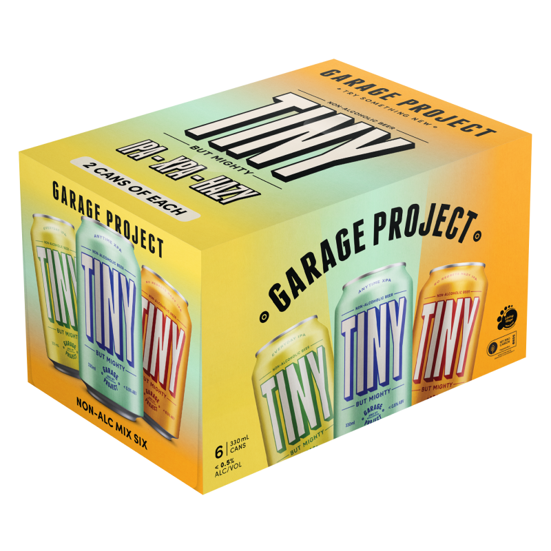 Tiny but Mighty. Big things sometimes come in little packages. Say hi to Tiny: Big flavour, without the booze so you can enjoy it anytime, this pack has 2 of each of the Garage Project's non-alcoholic Tiny Range: Tiny IPA, Tiny XPA, Tiny Hazy IPA