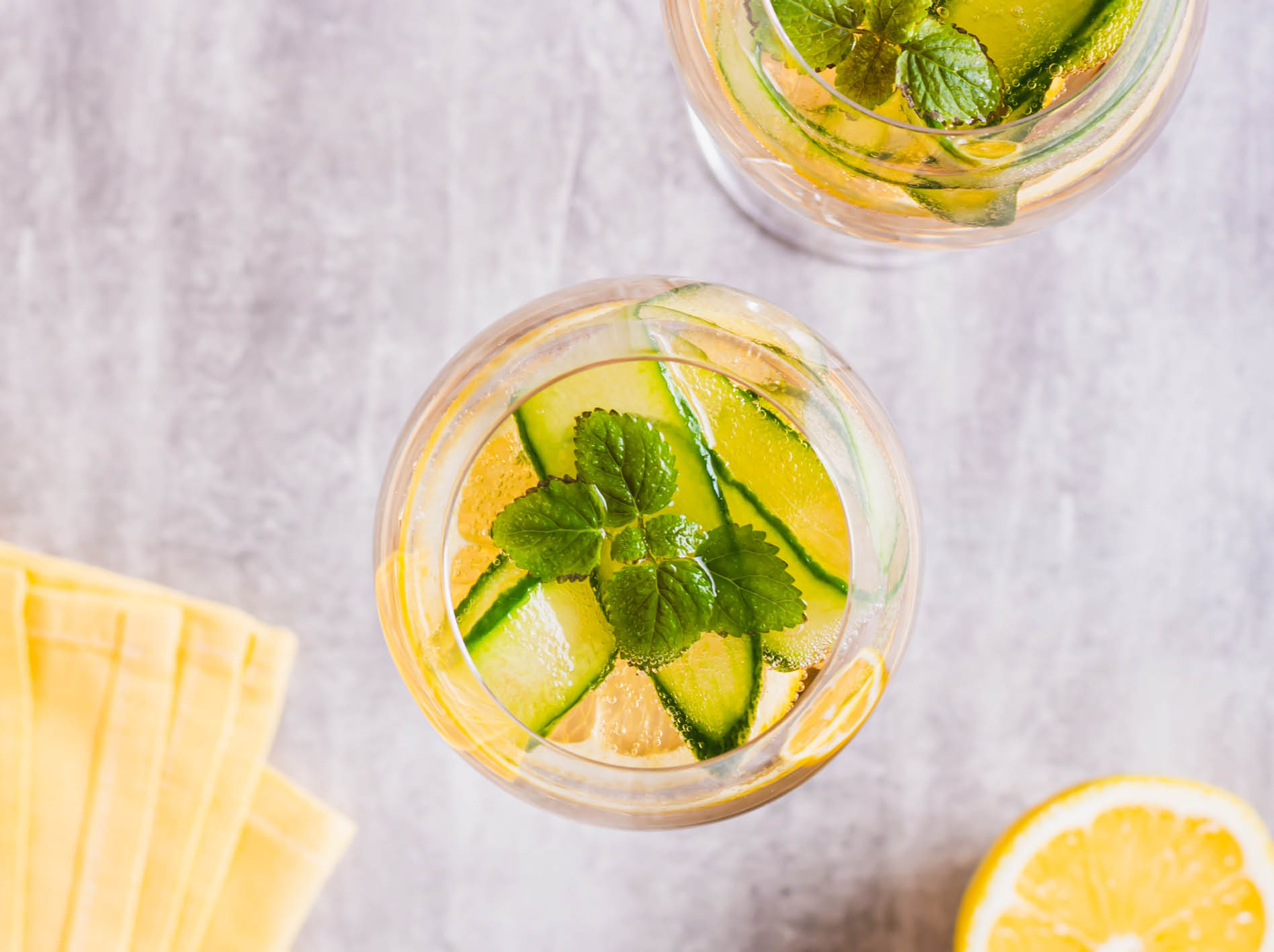 3. Garnish with a long, thin slice of cucmber and a lemon wheel.