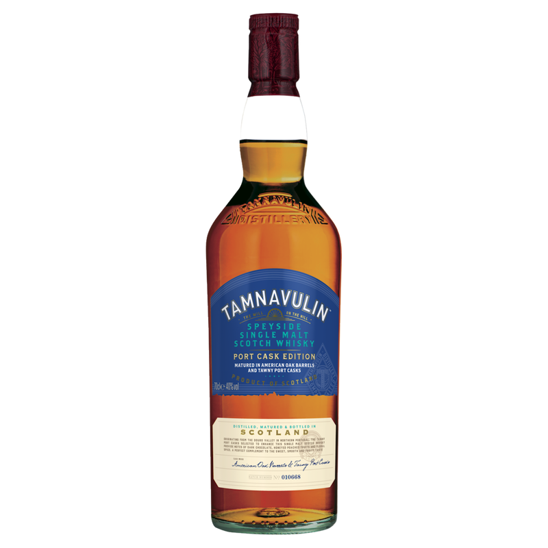 Part of Tamnavulin's Cask Editions range, this expression brings the rich, indulgent character of tawny port to their signature Speyside single malt. Initially matured in American oak ex-bourbon casks for smoothness and balance, it is then finished in port casks, adding depth and warmth. Expect notes of dark chocolate and berry compote layered over Tamnavulin's classic sweet, smooth, and fruity house style. In the glass, it shines a deep mahogany. The nose offers a decadent aromas of ripe red berries, plum, dark chocolate, rose syrup, sweet biscuit, and spiced orange. On the palate, discover flavours of honeyed poached pears, berry compote, dried fruits, and creamy caramel, finishing with a soft, nutty finish.